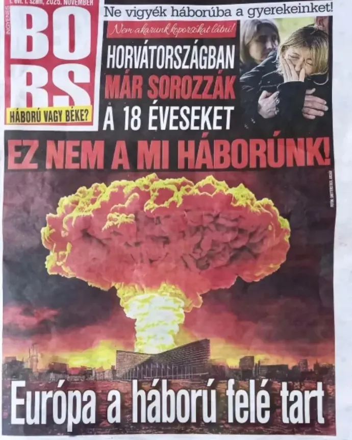 A Bors remek hangulatú kis különkiadványában egyébként olyan anyagokkal igyekeznek rettegésben tartani az olvasóikat, hogy Horvátországban hamarosan besorozzák a fiatalokat (2026-tól két hónap kiképzés lesz kötelező mindenkinek), illetve mindenféle Fidesz-közeli híres ember panaszkodik a háborús nyomasztás miatt, mint Pataky Attila, Gregor Bernadett vagy Muri Enikő volt élettársa.