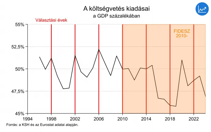 A nyár elején viszont Nagy Márton nemzetgazdasági miniszter kijelentette, hogy „a választási költségvetés a baloldal sajátja” és ilyet a Fidesz nem tenne. Ennek ellenére nemrég bevallotta, hogy mégis. A Defacto jelmondata alapján tehát „építsük tényekre a közbeszédet”, és nézzük, mit mutatnak a számok. Az első ábránkon azt mutatjuk meg, hogy az egyes években a költségvetés mennyit költ a gazdaság teljesítőképességéhez, a GDP-hez, képest. Piros vonalakkal jelöltük a választási éveket. Jól látszik, hogy a 2006-os választásig minden választási évben megugrottak a kiadások, ami persze annak is tulajdonítható lehet, hogy a leköszönő kormány így próbálja javítani a választási esélyeit, de annak is, hogy az új kormány az ígéreteit próbálja gyorsan beváltani. 2010-ben és az utána következő választási években, az ábrából úgy tűnik, már nincs választási költekezés.