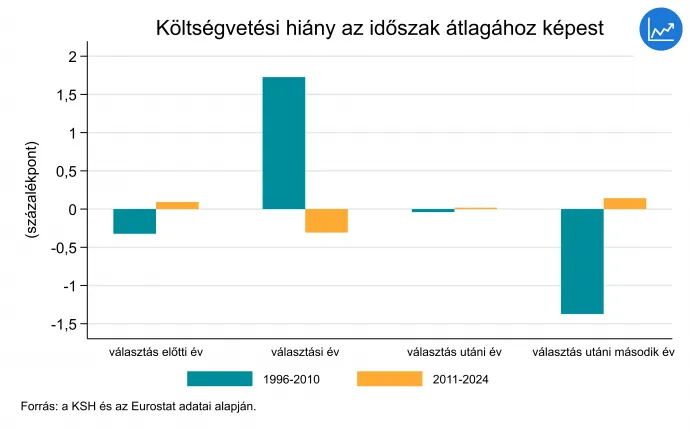 Az összehasonlíthatóság végett két időszakot különböztetünk meg: a Fidesz-kormány elmúlt 14 évét 2011-től 2024-ig és az 1995 és 2010 közötti 16 évet, ami főleg baloldali kormányokhoz köthető. Az ábrán azt látjuk, hogy 2011 előtt a költségvetés hiánya a választási években tényleg a GDP 1,7 százalékával magasabb az átlagnál, a választás körüli években meg ennek ellentételezéseként a hiány az átlagnál alacsonyabb. Ezzel ellentétben